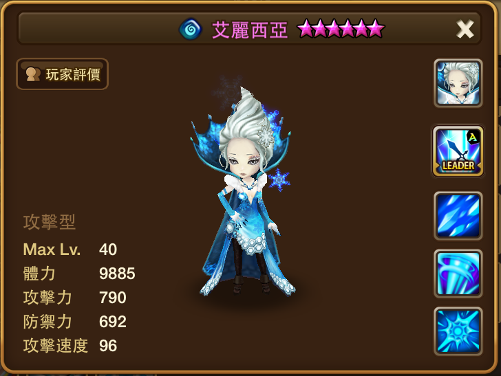 名稱 | 艾麗西亞 | 屬性 | 水屬性 | 類型 | 攻擊型 | 攻擊速度 | 96 |
