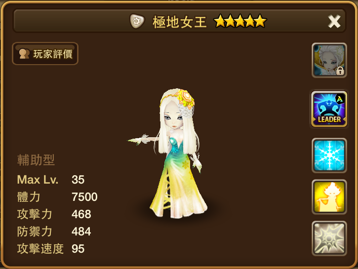 名稱 | 極地女王 | 屬性 | 光屬性 | 類型 | 輔助型 | 攻擊速度 | 95 |