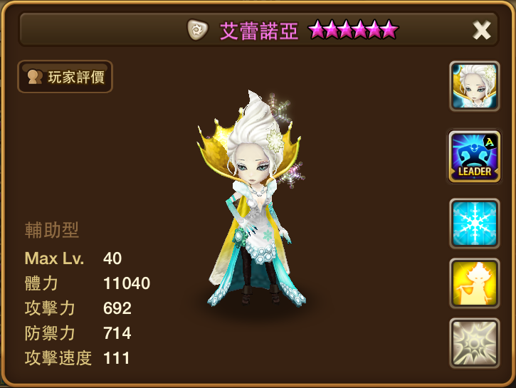 名稱 | 艾蕾諾亞 | 屬性 | 光屬性 | 類型 | 輔助型 | 攻擊速度 | 111 |