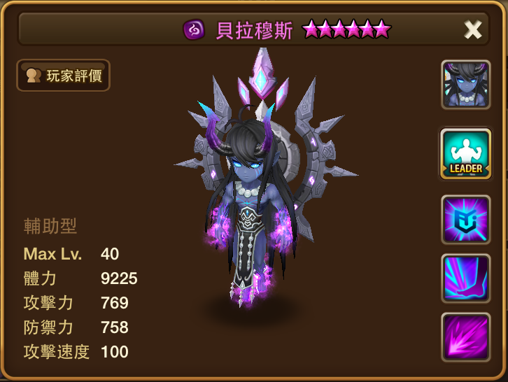 名稱 | 貝拉穆斯 | 屬性 | 暗屬性 | 類型 | 輔助型 | 攻擊速度 | 100 |