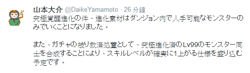 山本製作人於稍早在推特發布新訊息,指出目前的規劃方案為:究極覺醒進化的進化素材將只限於能在地城中打到的角色。