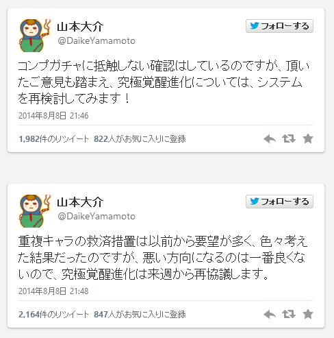 然而由於進化時需要 2 隻稀有轉蛋(レアガチャ)限定的角色,許多玩家於直播發表後於各種管道提出了不滿的意見。山本製作人隨後也在自己的 Twitter 上發布聲明,指出此一系統的設計原本是為了解決許多玩家對於「手邊有很多重複角色」的問題反應,並且也已確認過並沒有違反日本的「成套轉蛋(コンプガチャ)」法令。不過若是往玩家所不樂見的方向發展,並非官方的本意,因此會再針對究極覚醒進化系統進行檢討。