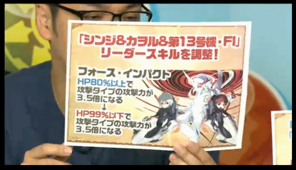 此外,為紀念日本將自 8 月 22 日起連續 3 週播放《福音戰士新劇場版》系列,《新世紀福音戰士》的合作也預定將於近日復刻。「真嗣&薰&第 13 號機・ FI」的隊長技能也宣布將會變更,攻擊力上升的發動條件由原本的「HP80%以上」改為「HP99%以下」。
