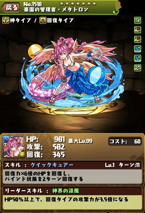 同時,「女子轉蛋」限定寵物「樂園管理者・梅塔特倫(楽園の管理者・メタトロン)」也將以通常機率登場!「樂園管理者・梅塔特倫」並非「梅塔特倫」的進化分歧型態,而是獨立的角色。除了屬性變為「水/光」之外,能力值與覺醒技能等與「神書管理者・梅塔特倫(神書の管理者・メタトロン)」幾乎相同。