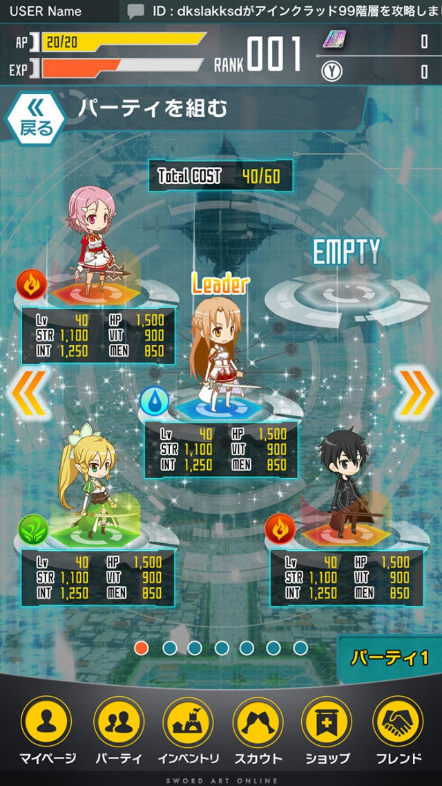 本作是以人氣輕小說《刀劍神域》為故事題材所製作的全新手機 RPG,玩家可以將《刀劍神域》中熟悉的角色們組成自己喜歡的小隊來跟強敵戰鬥。戰鬥系統是以觸碰操作順序來攻擊敵人的,雖然操作單純,但如果能活用角色的特色技能,並且善用將已行動跟未行動角色交換的“開關”系統的話,就可以讓戰鬥變得更有利。