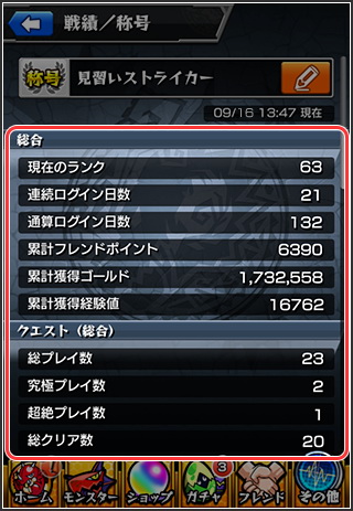3.0 改版也加入了戰積查詢與稱號功能,這部份可讓玩家查看總挑戰數、究極關卡通關數、總零石通關、最大 HIT、造成最大傷害量等遊玩資料。需要注意的是,部分戰積的統計資料將於 3.0 改版後才開始計算。