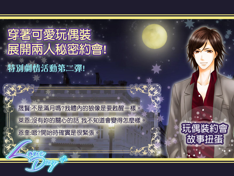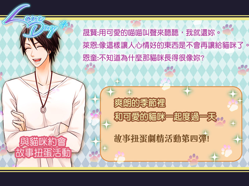除了小遊戲以外,特別加開兩篇特殊劇情,讓玩家在漫長的連假也能有不一樣的心情!要當他的貓,還是說要和他穿上玩偶裝去約會呢?情侶間的角色扮演,會不會擦出火花呢? 就要讓玩家自行來體驗囉!