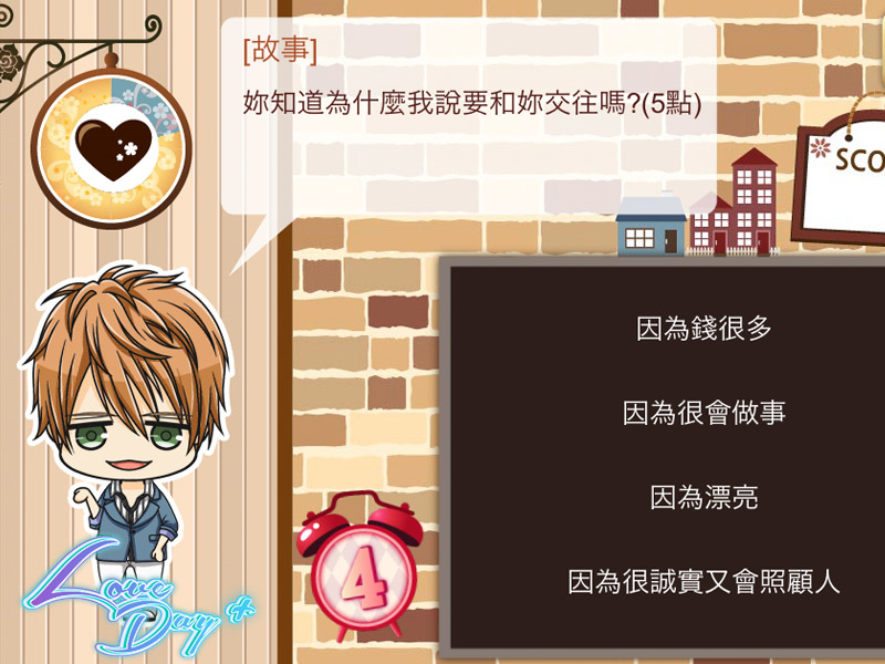 為了擄獲他的芳心,只抓住他的胃也是不夠的哦!現在他與你將來場小遊戲,要考驗聰明的你在時間內能夠回答多少他的疑問,問題除了和他平常相處的小細節外,不免也會有些旅遊、生活上的小常識,讓玩家可以在遊戲中也提升內涵,哪天在現實中遇到男主角時,才能順利擄獲他的芳心哦!