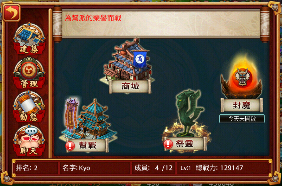 幫會系統中共分為四大功能『幫戰』、『商城』、『祭靈』『封魔』,每個功能都可以給玩家的隊伍帶來極大的助益,更有機會獲得一些珍稀的稀世材料,各位玩家千萬不要錯過任何一個活動喔!!