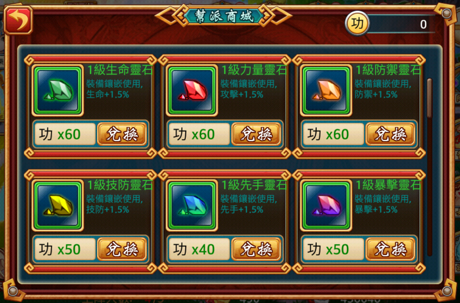幫派商城中,有許多一般無法輕易見到的各種神祕靈石,靈石可以鑲嵌在強力的裝備上,可以引動裝備隱藏的潛力,提升裝備的攻擊、防禦等屬性,越高級的靈石,所引動的裝備潛力越高,但是兌換靈石,需要消耗功德值,想要獲得這些靈石的玩家們,可要多多參加幫會中的活動,來累積功德值唷!!