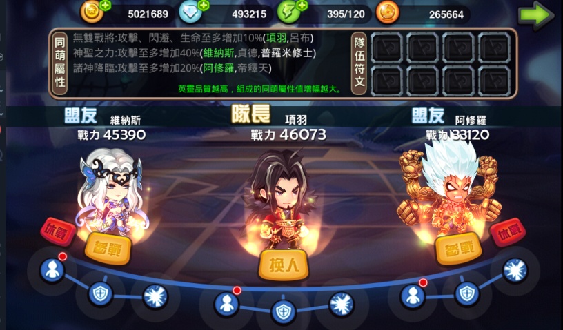 英靈組隊時,最多可上陣3人,上陣順序為從左至右,由隊長首先出戰。同萌屬性是每個英靈之間相互感應的屬性加成,當上陣英雄屬同一同萌屬性時,會獲得額外屬性加成。在符文殿中獲得符文,也會提高小隊成員屬性。