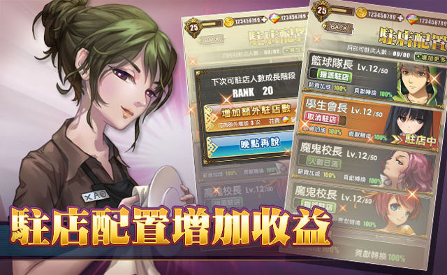 而在薪資打工模式中,本次改版讓您將可以派駐您的學員到店裡一起打工,除了可以賺取更多的金幣之外,甚至還可能獲得更多的貢獻點數!角色越多、等級越高,駐店的回饋效果也就越好喔。