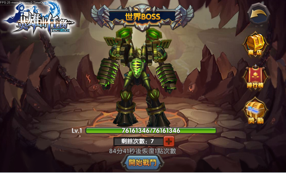 隊伍達到 34 級後即可於每天中午 12 點到晚上 8 點進入「世界Boss」界面發動攻擊,只要攻擊 BOSS 就會累積殺氣,傷害越高殺氣也會越高,而被擊殺的BOSS更將不斷自我重生升級,最高將變身成為 70 級的魔王。凡參加每一伺服器的「世界BOSS」活動,不論其傷害大小皆可取得能夠前往 BOSS 商店中兌換精煉石道具及英雄魔晶石的「戰功」,另外,BOSS 等級越高,獎勵也將越豐富。