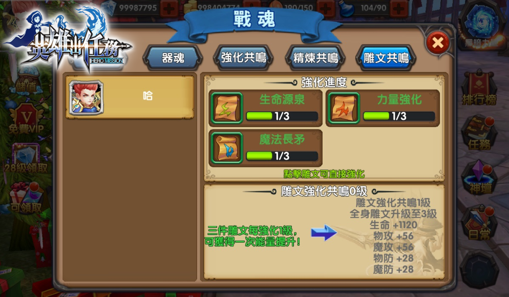 此外,每位英雄夥伴身上的 4 件裝備與 3 個雕文只要同時精鍊和強化到指定同級,就能夠產生共鳴效果,觸發後更會額外增加該名夥伴的戰鬥屬性。