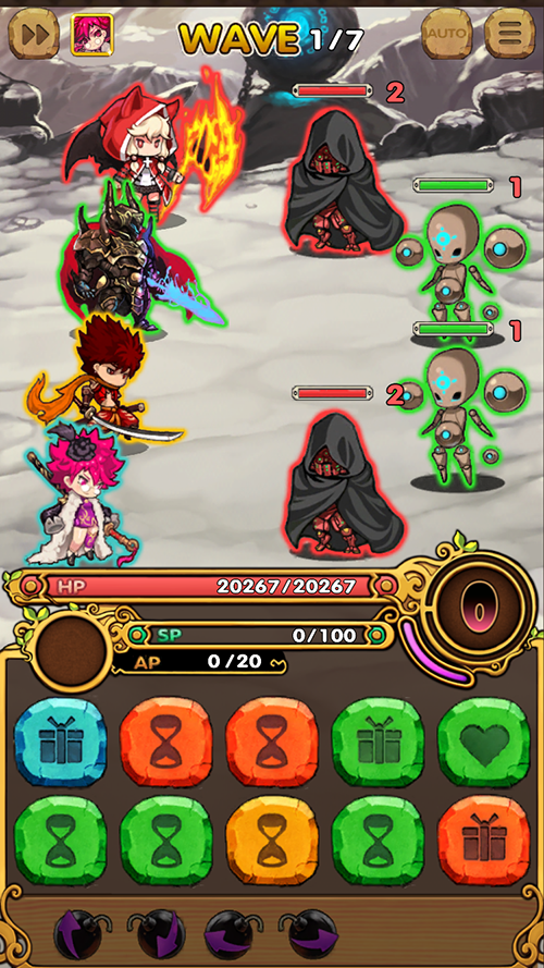 像莉娜雅一樣老是點不準接不到Combo嗎?忽然想喝個水卻騰不出手來嗎?遊戲內增加「自動戰鬥」模式,只要在戰鬥中按下「Auto」就可以輕鬆Combo不中斷,是不是很威呢?不過,想釋放角色技能的話,必須把自動戰鬥模式取消唷!當隊伍茁壯強大,眨眼即可輕鬆致勝,就心無懸念的Auto下去吧!!