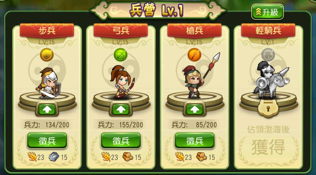 《 無雙兵團 》中目前共開放有四個兵種:步兵、弓兵、槍兵、輕騎兵。