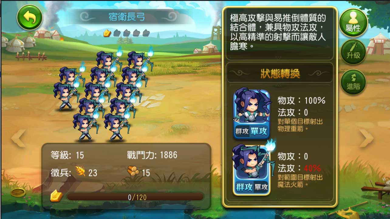 弓兵在戰場的最後方,是遠程輸出主力。弓兵技能分為單體(物理攻擊)、群攻(法傷攻擊)兩種,因此在調配弓兵時,尤其要深諳敵方配備、屬性。