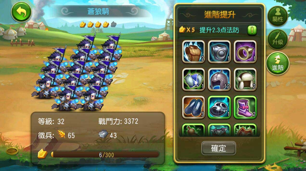 兵團也可進階和升級。無用的裝備和特殊道具都可以幫助兵團進階,兵團品質提升後,連名字都會變得更炫酷哦!