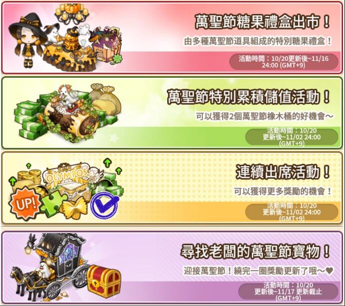 除此之外至11月 2日止依累積交易金額,最多發送2個可縮短紅酒生產量的「萬聖節幽靈新娘橡木桶」。通過連續簽到活動,發送「7 Cash」、「奧林巴斯幸運福袋 」等優惠。 11月16日、17日分別進行銷售可獲得1種萬聖節主題道具的幸運福袋與「尋找老闆的萬聖節寶物」活動。
