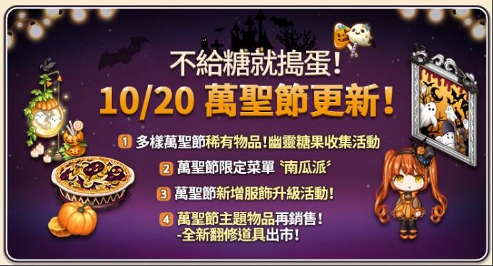10月20日萬聖節更新中,將進行各種萬聖節相關道具活動。至11月2日止推出萬聖節紀念限定菜單「南瓜派」,等級12以上玩家皆可製作。作為達成菜單等級5與完成任務獎勵,最多可領取10 Cash 。