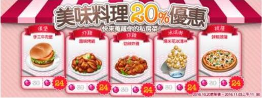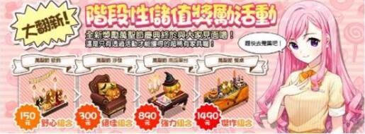 即日起,儲值獎勵大翻新,只要依序由小到大儲值指定面額的鑽石,除了可以獲得可愛的萬聖節鬼鬼家具之外,還有大量的鑽石、金幣、愛心以及打掃券。150元野心組合可以獲得萬聖節壁飾,300元絕佳組合可以獲得萬聖節沙發,890元強力組合可以拿到萬聖節南瓜架台,1490元傑作組合可以獲得萬聖節餐桌。已經用完儲值獎勵的玩家也不用擔心,所有玩家的購買資格也會全面重置。