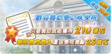 除了首儲贈送背景外,只要轉校生們成功贊助學院150元,即可獲得210顆鑽石,但最棒的是往後的30日首次登入,還會得到學院謝禮25顆鑽石!不過助教還是要提醒轉校生們,此項活動必須等到領取完畢後才能再參加,且每個月最多只能參與一次,不能累計參與或領取喔!