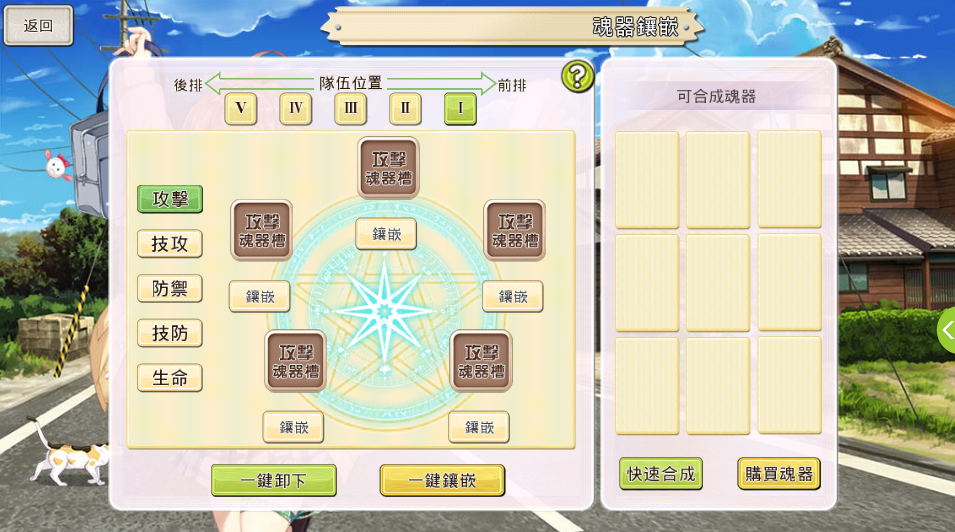 隊伍中的每一個殺器的隊伍位置都可以鑲嵌5種不同類型的魂器,每種魂器最多可以鑲嵌5個。比如前排的殺器,在隊伍 I中就可以鑲嵌[攻擊魂器]、[技攻魂器]、[防禦魂器]、[技防魂器]與[生命魂器],每種寶石可以鑲嵌5個。後排的殺器,在隊伍Ⅴ中就可以鑲嵌[攻擊魂器]、[技攻魂器]、[防禦魂器]、[技防魂器]與[生命魂器],每種寶石可以鑲嵌5個。
