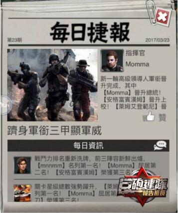 在「制霸全球」全新資料片中,新增「每日捷報」功能,玩家只要於每日首次登錄時,系統即會自動彈跳出昨日資訊捷報畫面,讓玩家可以馬上查看關於昨日伺服器發生重大事件資訊。無論是戰力排名、軍團排名的變動,還是激烈戰鬥、部隊革新等資訊,都能在「每日捷報」中查看。未來還將開放更多新功能,像是FB分享、頭條人物發文等內容,敬請期待哦!