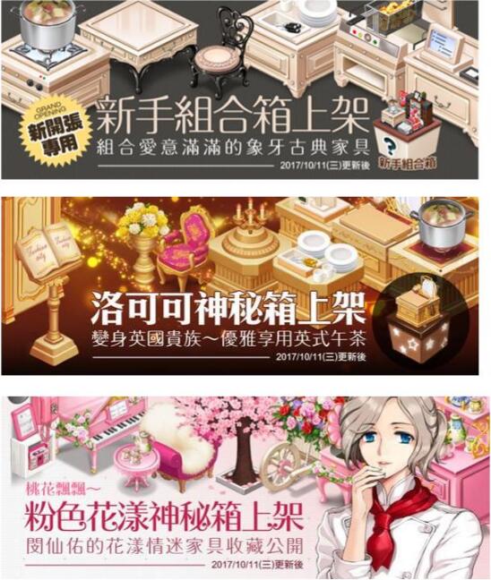 即日起,開幕限定新手組合箱,打造雅緻清新的象牙白古典風格餐廳。另外,完美演繹英倫貴族風采的洛可可神秘箱,讓餐廳進入貴族生活圈的奇幻色彩。另人桃花飄飄的粉色花漾神秘箱上架販售,閔仙佑的花漾情迷家具收藏公開。異國美食體驗,即日起-10/25(三)更新前,活動期間,主線及支線系列任務務獎勵200%。