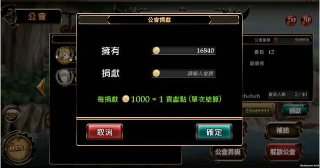公會的經營是需要大家一起努力的,只要有目標提昇公會勢力、進級,就不要吝嗇為公會的付出,把金幣、資源等捐獻給公會吧!捐獻將會換成公會的貢獻點,同時協助完成任務也可得到貢獻點!大家可於公會會員列表上看到各成員的週貢獻及總貢獻。您的默默付出將一目了然了。提醒一下,如對公會沒有貢獻的成員,將不會得到任務獎勵的!