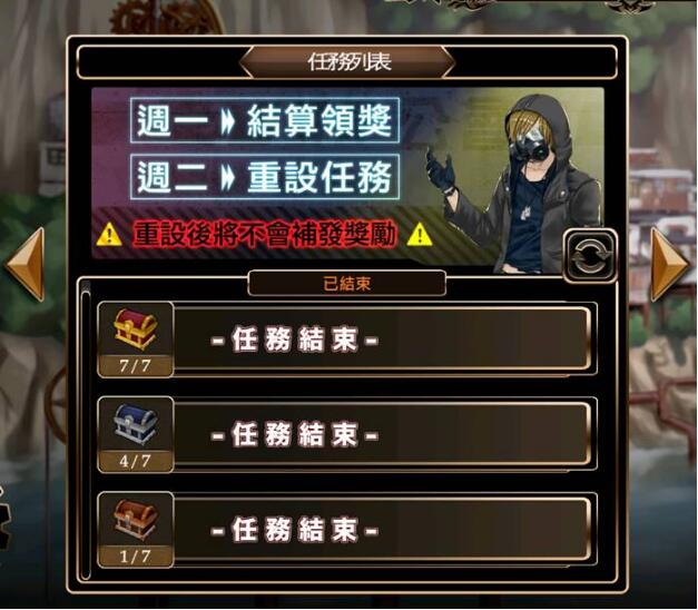 任務結束與領取結算獎勵: 每週一 00:00~23:59 (時間過後將不會補發獎勵)
