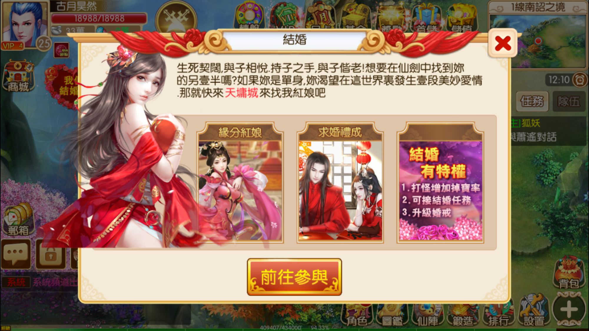 婚姻是什麼?有人說,婚姻是愛情的墳墓;有人說,婚姻是愛情的宮殿;在這裡婚姻肯定是愛情的寶殿,只要男女隊友心投意合完成結婚儀式,在接續的組隊任務中會增加掉寶機率,讓你們攜手闖蕩江湖之餘,口袋滿滿寶物滿滿~