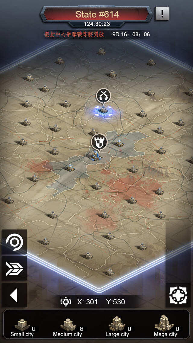 依照城市級別差異,攻佔的難易度也不盡相同。當聯盟佔領一座最高級別的城市「首都」,將於周邊自動形成勢力,同時取得攻打「發射中心」參戰資格。