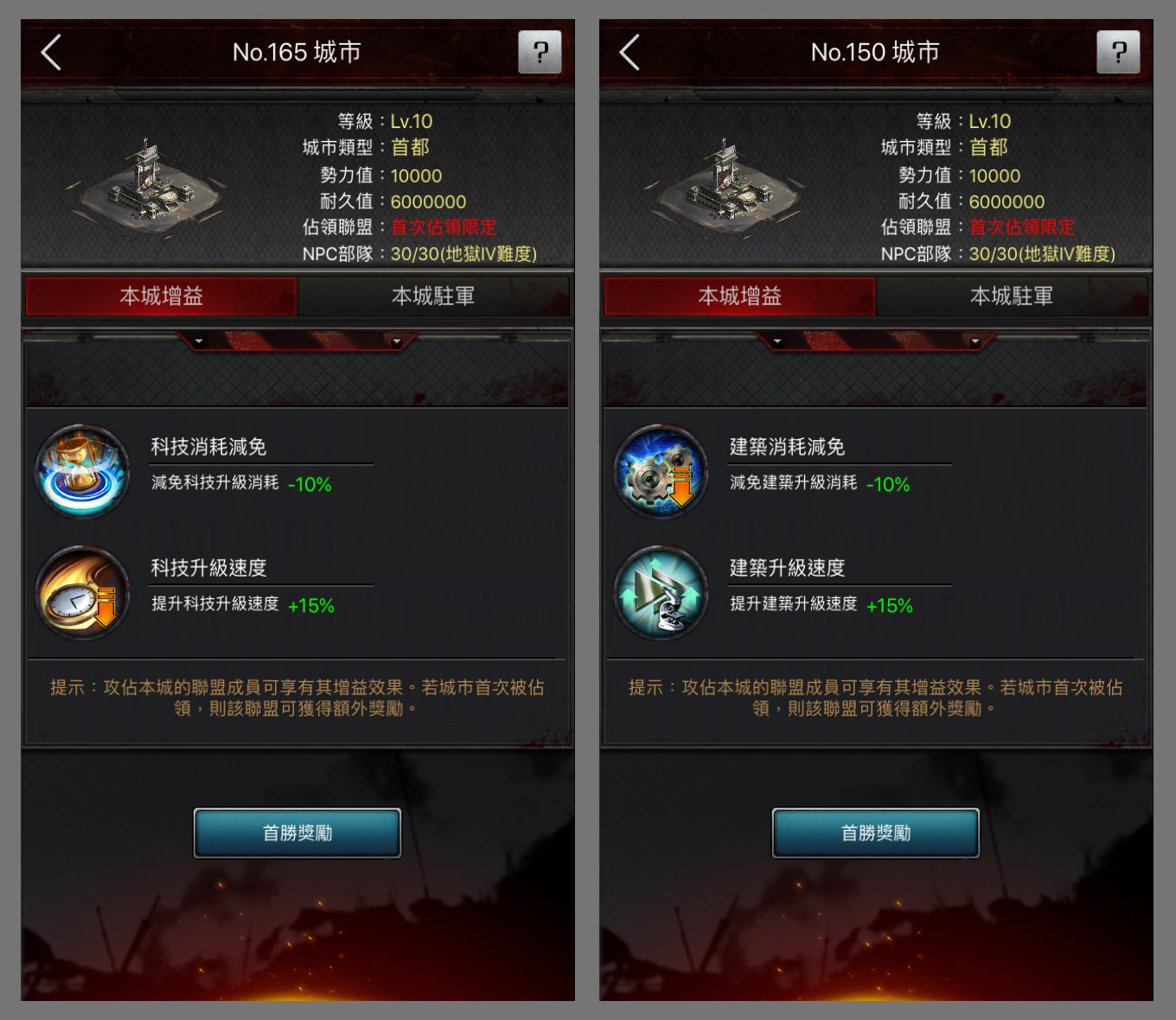 在這末日世界裡,每座城市都是難民的希望。當聯盟佔領城市後,根據不同的級別,則可享受特定的增益加成。以「首都」為例,作為最高級別,提供的效果自然非常強大,不僅有攸關玩家成長的建築及研究相關增益,還有足以扭轉戰局的部隊攻擊和帶兵量加成。