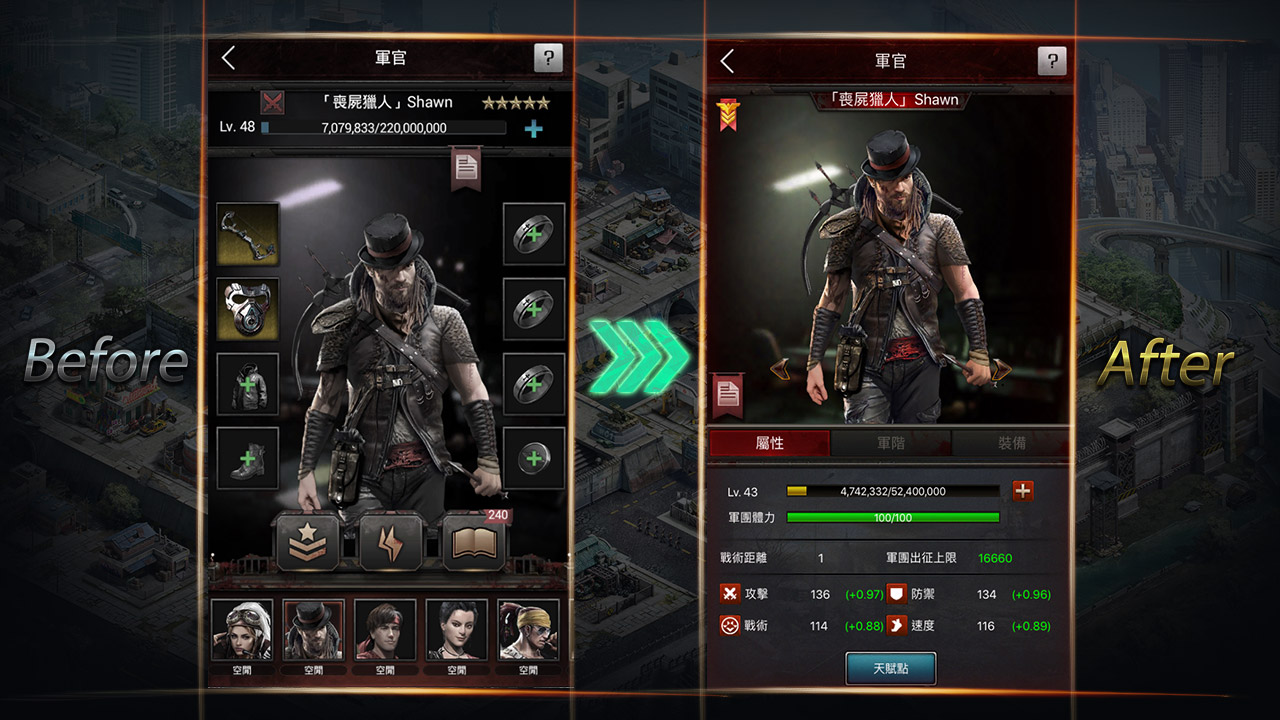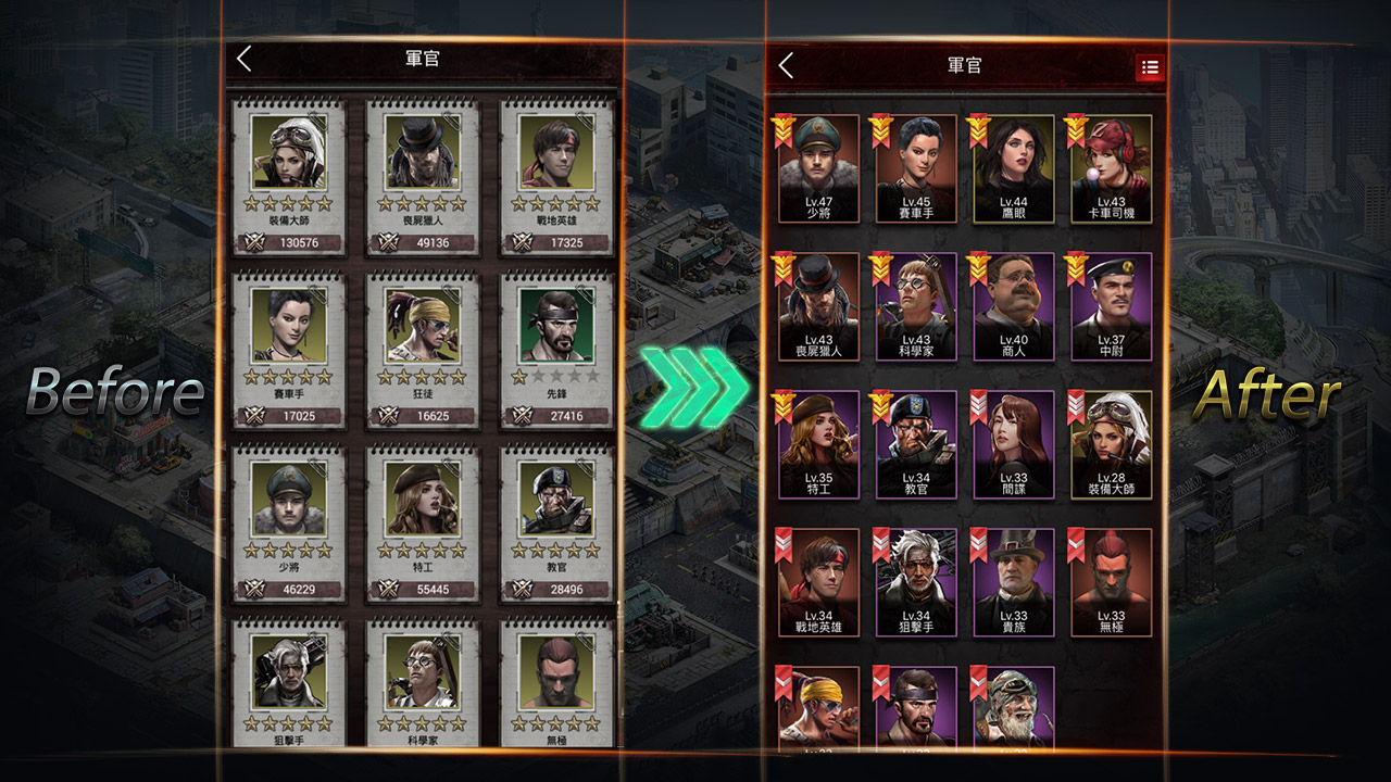 汰舊換新是進步的原則,新物必須新裝。全新的軍官介面有別以往,著重於個人展示,類似RPG的介面風格強調每位軍官都是獨一無二的存在,更加簡潔清晰的屬性面板完美詮釋每位軍官的戰鬥風格。