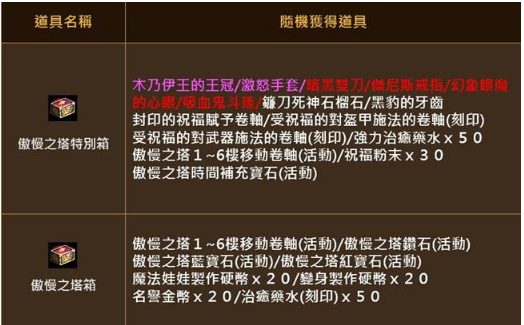 開啟「傲慢之塔特別箱」將有機會獲得紫裝「激怒手套」、「木乃伊王的王冠」或紅武「暗黑雙刀」