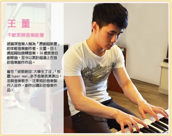 被資深音樂人稱為「原創超新星」的年輕音樂創作者 - 王董,自 6 歲起開始接觸音樂,14 歲就會自創歌曲,至今以累計超過上百首的音樂創作作品。曾在「綜藝節目:大學生了沒」、「校園 Super man」參予音樂表演演出,並與音樂歌手 - 汪東城的音樂製作人合作,創作出精彩的音樂作品。