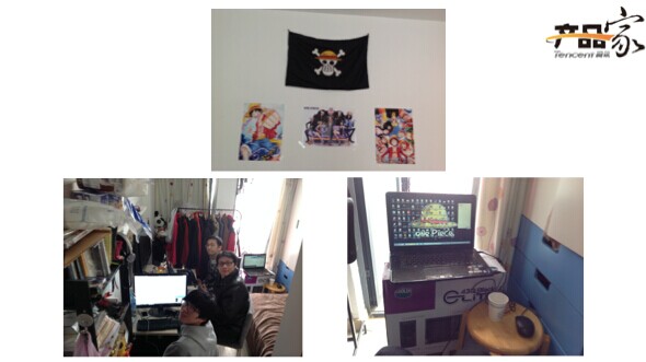 這是當時創業的環境,這個是我的小夥伴,他每個週末來到我家辦公,這是我牆上掛的海賊旗,貼一些海報,這是我的工位,一個板凳、一個位置。