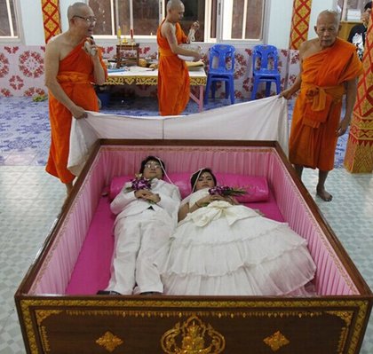 泰國一對新婚夫妻,在婚宴上躺在棺材裡接受祈福。翻攝《中國日報網》