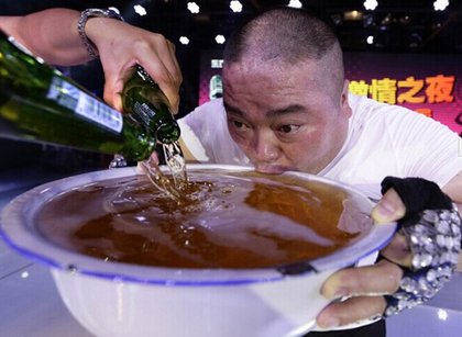 北京一名歌手用臉盆喝酒,感謝歌迷。翻攝《中國日報網》