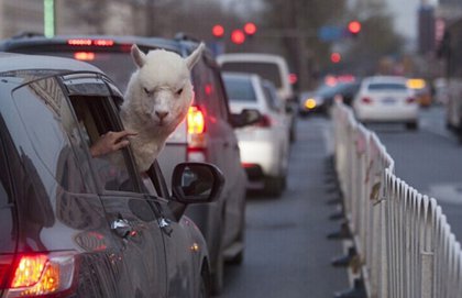 一隻 羊駝 出現在中國長春的車上,牠從車內探出頭來。翻攝《中國日報網》