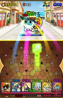 在進行動作戰鬥時,玩家只要點擊畫面下方的太鼓即可讓「迷你咚」隨之彈起,掉進底部橫向排列的「角色方塊」之後便會化作該角色的攻擊力,累積越多隻迷你咚則攻擊力越高。此外,若是迷你咚撞擊到各種顏色的「效果針(効果ピン)」還會觸發正面效果,例如擊中藍色會出現「迷你機械咚」、綠色會出現「技能用效果球」、紅色會出現「回復用效果球」等等。
