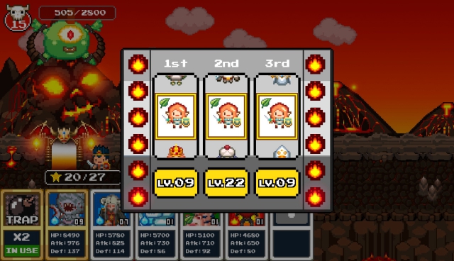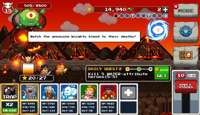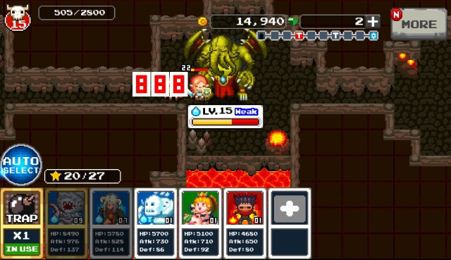 當完成準備後,玩家就可以準備迎接 英雄 們的侵襲。要開始戰鬥的話,首先必須拉到畫面中的拉霸,這時會隨機出現三名 英雄 ,玩家將得在固定的回合數內擺放 怪物 ,設法讓旗下 怪物 將 英雄 通通打回老家。