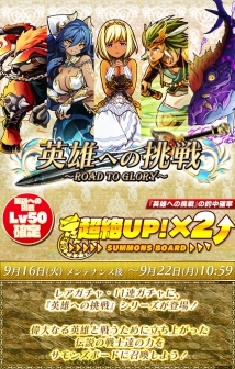 「稀有轉蛋」以及「11 連轉」中會出現的「向英雄挑戰」系列中獎機率將會在限定期間內變成超絶UP! × 2 & Lv50 。