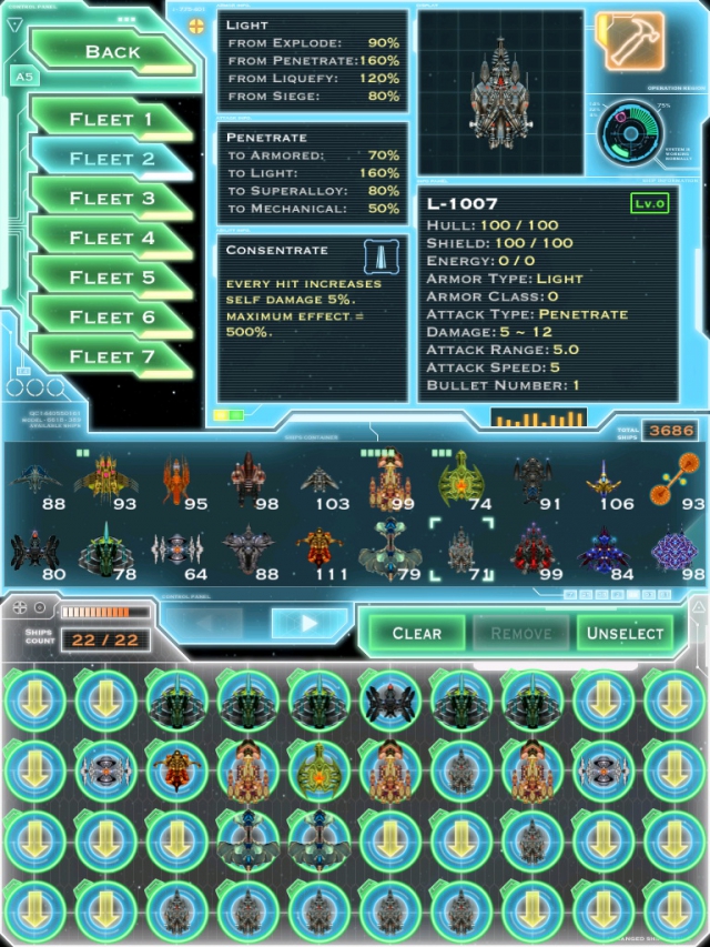 目前遊戲中提供了 40 種不同的太空戰艦,每種戰艦都各自有不同的能力值,及特殊能力。玩家必須好好想清楚如何配置,包括位置、屬性、攻擊能力等等,才能讓自己的艦隊發揮最大的作戰能力。