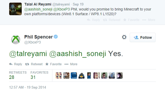 根據 Phil Spencer 的回覆,《 Minecraft – Pocket Edition》未來將會對應 Windows 8.1 系統的 Surface 平板裝置,此外 Windows Phone 版本也即將與玩家見面。