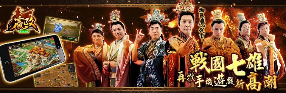 《 LINE 贏政 》講述的是戰國七雄爭霸的故事,那麼到底是哪幾位藝人能夠演繹歷史上的七位君主呢?加藤鷹領銜,七位知名男優傾情出演!即將公開的遊戲TVC中,加藤鷹以秦王贏政的形象出現,奧村友真扮演趙武靈王,阿川陽智出演韓昭侯,燕昭王由田淵正浩詮釋,東尼大木則飾演齊宣王,魏惠王、楚懷王分別由戶川夏也、小田切準出演。可能是有史以來最顛覆感官的代言人組合!營運團隊表示,之後不排除會邀請到七位代言人在遊戲中與玩家互動,完全值得期待喔。