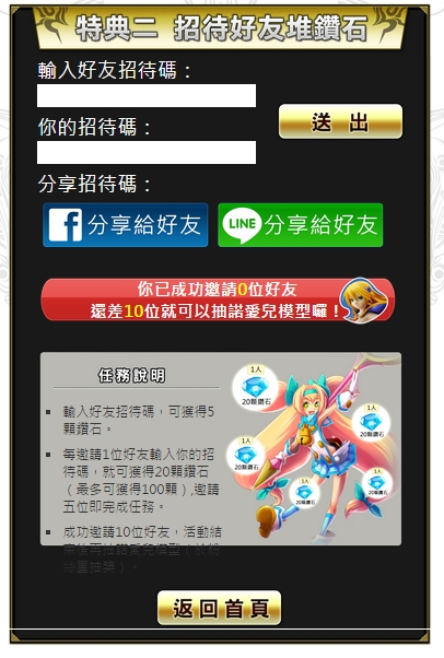 【活動概要】:將邀請碼分享給好友,邀請越多朋友,可獲得的鑽石越多;輸入好友招待碼還可額外獲得5顆鑽石