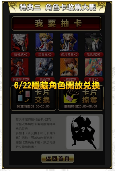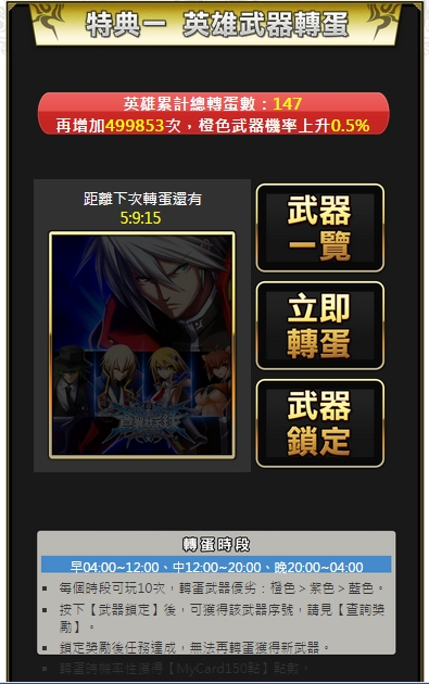 .玩家於每天三個時段可以進行轉蛋(早4:00~12:00、中12:00~20:00、晚 20:00~4:00)