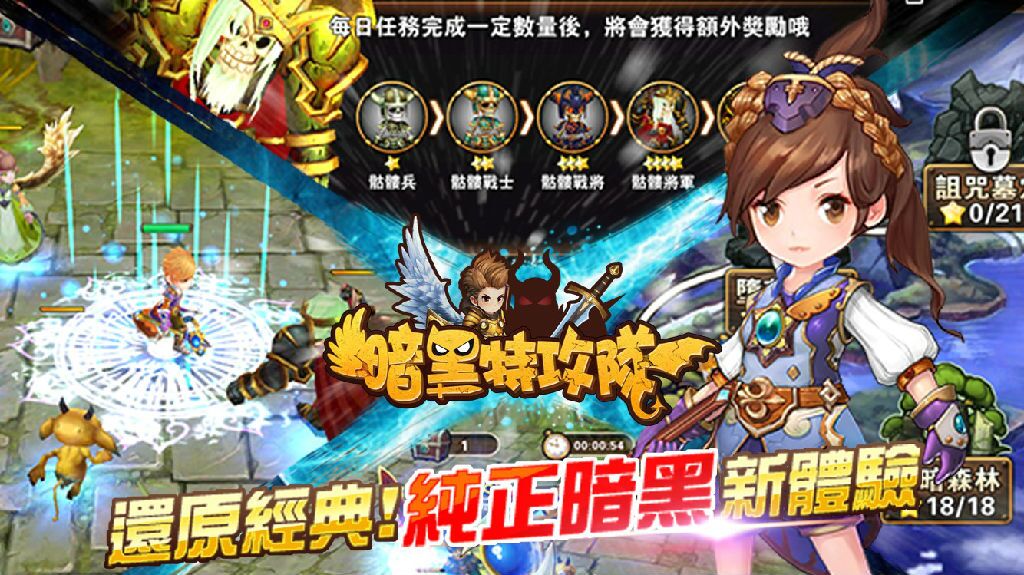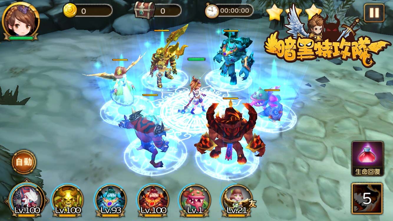 《 暗黑特攻隊 》除具備最刺激、火熱的對戰外,更擁有最簡單的操作方法,讓玩家可更快速上手,彈指間感受最獨一無二的戰鬥快感。玩家只要透過1指操作,即可瞬間發動最強大的攻擊,擊敗魔物。此外,遊戲中獨特的「自由戰鬥」模式,不費吹灰之力,幫助玩家徹底解放雙手,輕輕鬆鬆順利闖關。另,新穎的3D視角,主角不但可360度無死角的在各個地圖自由跑動外,可愛的萌寵夥伴還會自動鎖定目標進行最強大的攻擊,協助玩家打倒更多可怕魔物,突破更多關卡。